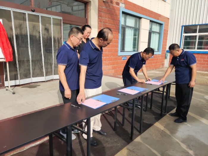 大會第三項,技術(shù)部王總監(jiān)、銷售部姜經(jīng)理、制造部于經(jīng)理簽署軍令狀,他們將責(zé)任扛在肩上,以實際行動為茂源的發(fā)展全力以赴。簽完后,三位領(lǐng)導(dǎo)將軍令狀置于胸前,留下了莊重的一刻。